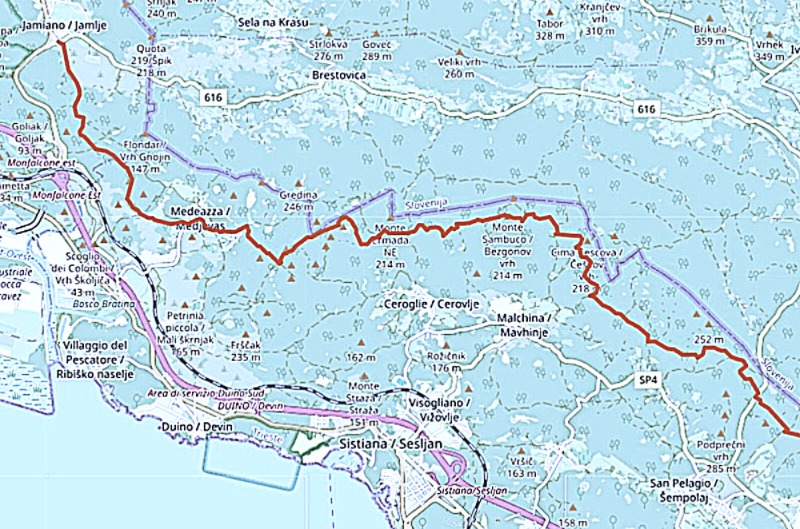 Rappresenta l’ultima parte della lunga traversata carsica, che parte da Pese e attraversa tutto il Carso con un percorso complessivo superiore ai 50 km. Dal Monumento ai Caduti in Piazza Libertà a Iamiano inizia il nostro percorso evidenziato da una larga strada forestale che scorre tra prati e campi coltivati sul fianco del vallone di Brestovizza, alveo dell’antico Timavo. Si attraversa una pineta d’impianto nell’area del Flondar e, dopo aver superato la selletta di Dosso Giulio e aver lasciato a destra il bivio con il sentiero n° 16, che scende al Timavo, si giunge sulla strada asfaltata che entra nel paese di Medeazza. Seguendo i segnavia, si attraversa il paese e si continua lungo una strada sterrata tra pascoli, vigneti e proprietà private fino alla base di una ripida scarpata percorsa dal tracciato dell’oleodotto transalpino. La si supera faticosamente e si aggirano sulla destra postazioni austro-ungariche della Prima Guerra Mondiale e il massiccio dell’Ermada, raggiungibile con una breve deviazione (segnavia n° 8). In discesa si arriva alla carraia che proviene da Ceroglie, e proseguendo lungo pascoli, querceti e doline, si supera il sassoso Monte Sambuco (213 m). Procedendo tra la boscaglia carsica ed i numerosi muretti a secco, si esce sulla carrareccia per Malchina, che si segue per poche decine di metri. Poi si devia a sinistra percorrendo un dedalo di strade forestali e, facendo molta attenzione alla segnaletica, per tracce di sentiero si arriva sulla SP 6 vicino al valico di San Pelagio. Ore 4,00.(fino a qui la nostra pertinenza)