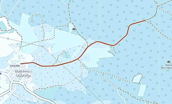 Il sentiero inizia a nord del paese di Malchina -Mavhinje ad un quadrivio dove si incrocia anche il sent.031 . Comoda carrareccia, inizialmente asfaltata , antica via percorsa da mezzi agricoli che unisce le località carsiche di Italia e Slovenia con un percorso transfrontaliero . Lasciate le ultime case e un agriturismo si prosegue affiancati dai classici muretti a secco , campi coltivati , fino ad inoltrarsi nella boscaglia carsica. Lungo il percorso sono visibili alcuni cippi che ricordano un cimitero della prima guerra ,e una targa che ricorda la presenza del vicino confine di stato che occasionalmente veniva aperto per incontri di amicizia e pacifica convivenza fra i popoli. Il breve sentiero che termina all’incrocio con il sentiero 003 (Alta via del Carso) è parte iniziale della tappa 24 del Sentiero Italia che conduce verso l’ex valico di San Pelagio e Repen.